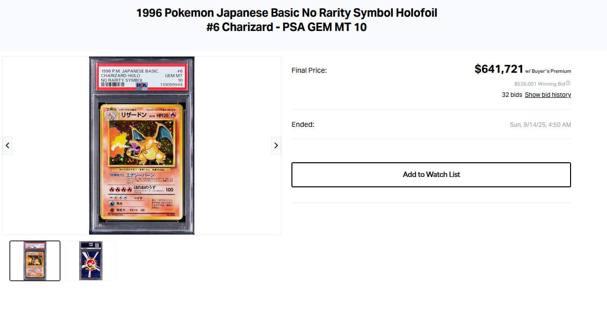 2025 年 9 月,Goldin Auctions 曾拍出一張 PSA 10「無稀有度」噴火龍,成交價 641,721 美元,一度刷新噴火龍高價。