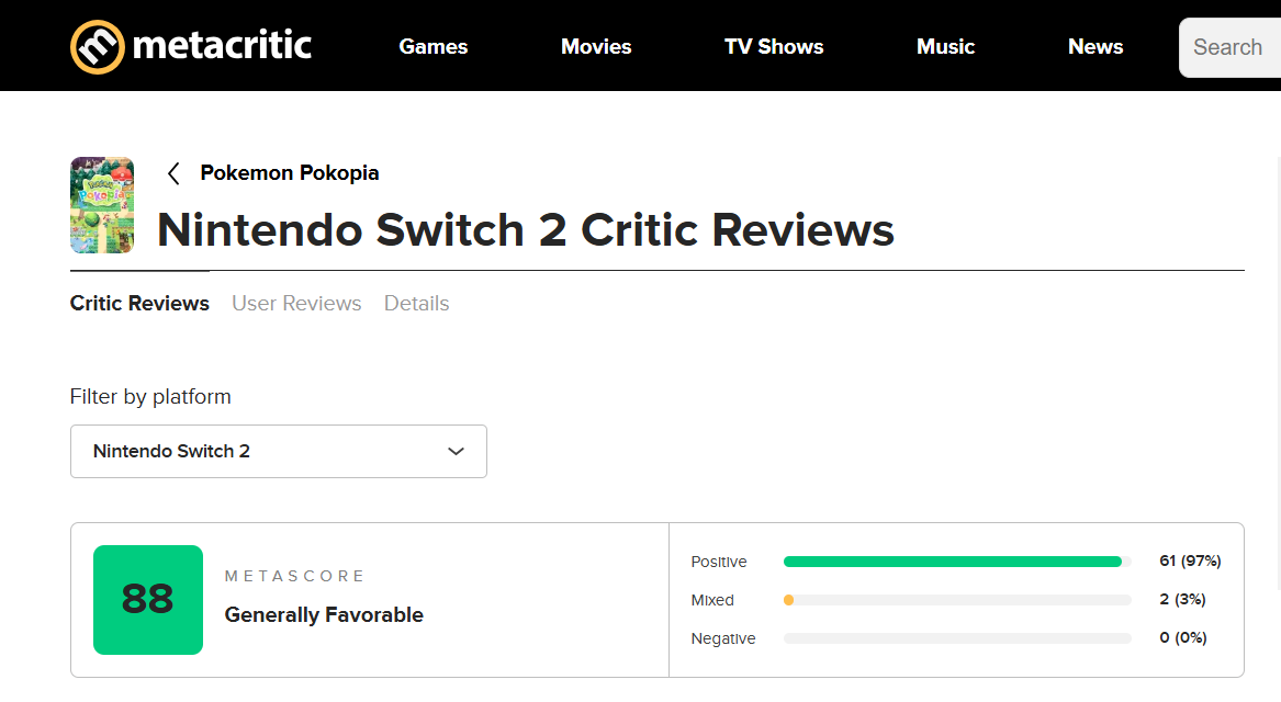 《Pokémon Pokopia》在 3 月 2 日解除評測禁令後,多家媒體評分集中釋出。依 Metacritic 彙整數據,本作最高來到 89 分,暫居 2026 年度最高分遊戲,同時也刷新《寶可夢》系列歷來最高分紀錄。